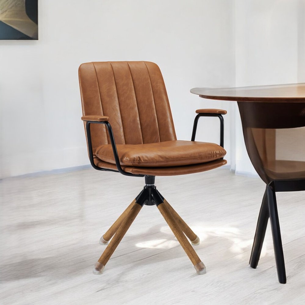 Stylish, elegant and fully functional, the 23-inch brown faux leather swivel arm chair adds a touch of panache to any set up. This sturdy faux leather upholstered arm chair comes in a chic solid brown color to give your space just the right look. This chair features a swivel function so that you can turn and angle easily to interact with your space. 34.06-inch h x 23.3-inch w x 25.1-inch d.