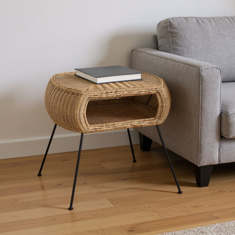Show off your exquisite taste with this 24" natural brown rattan round end table with shelf. Sturdy construction from woven rattan and iron give this table a unique look with tropical vacation villa vibes. Includes a single open shelf for handy storage or display space. A great accent on either side of the sofa or bed, this adorable end or side table is just what you need. You can match it with other pieces to get the ideal look for your place. 23.75" H x 24.25" W x 28" D