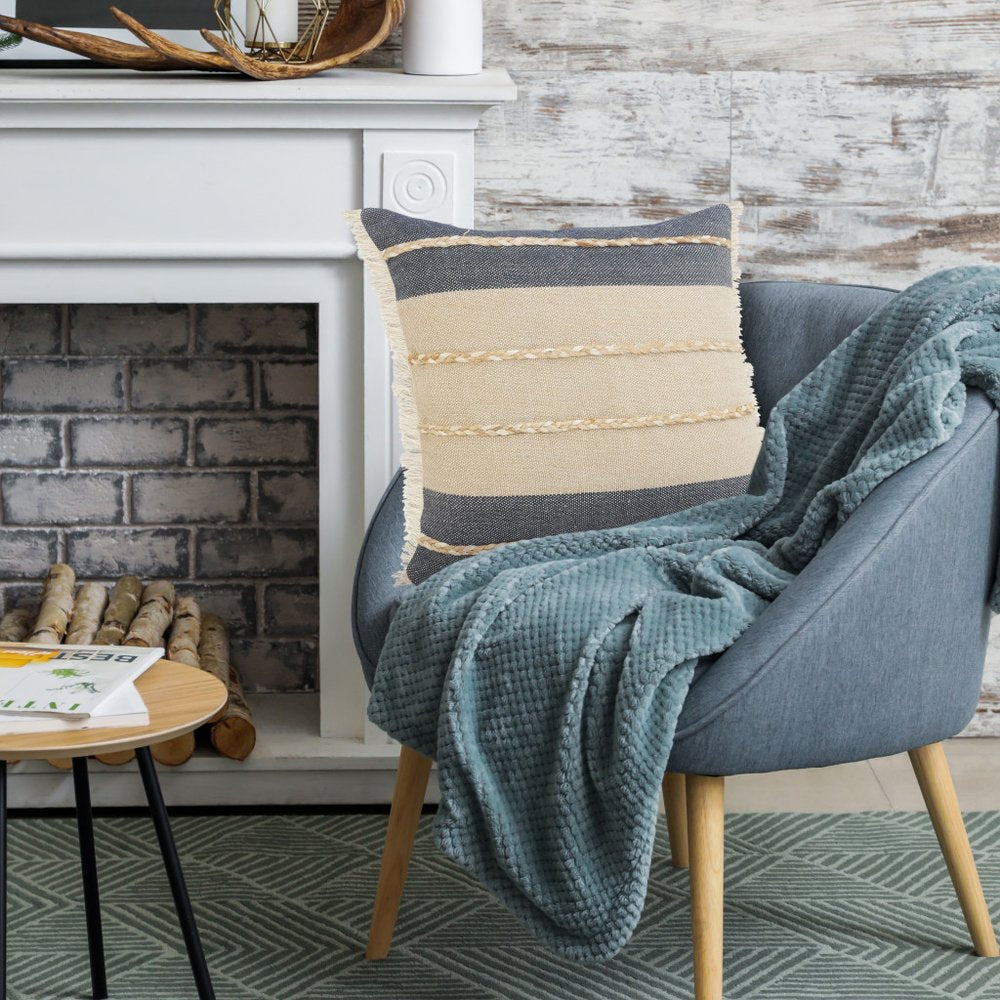 Unique and decorative, this comfortable 20" x 20" denim blue tan and taupe jute coastal zippered pillow will leave a lasting impression. This soft and durable decorative pillow is expertly made of high grade, long lasting jute in a denim blue tan and taupe coloration. For anyone that loves to decorate or accent their space with color and texture. Decorative pillows are a great way to change up the look and feel of your space easily and quickly. 4" H x 20" W x 20" D