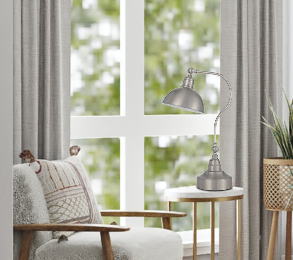 This 25-inch nickel metal lantern desk table lamp with nickel dome shade is a great way to add some brightness to any corner of your home. The base of this lamp is made of metal finished in a nickel tone. The nickel dome metal shade is finishes this piece off nicely and symmetrically this desk lamp provides 'task lighting' that will illuminate your working area for reading or writing. Use this lamp anywhere and elevate the look of the whole space. It is perfect for virtually any decor. 25-inch H x 9-inch W x 18-inch D