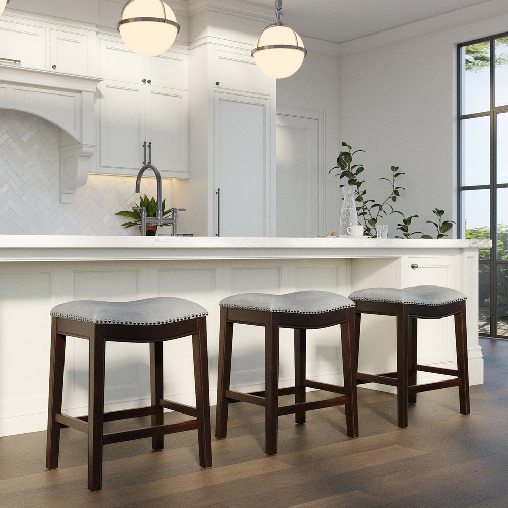Bring a trendy bar vibe to your space, with this 26-inch gray and espresso faux leather and solid wood backless counter height bar chair with footrest. A espresso solid wood frame is finished off with a gray faux leather seat that is the epitome of quality construction and design. Designed to be good looking and practical, this backless bar chair features a rectangle shaped seat. Designed with a footrest for comfort and convenience. 26-inch H x 20-inch W x 14-inch D