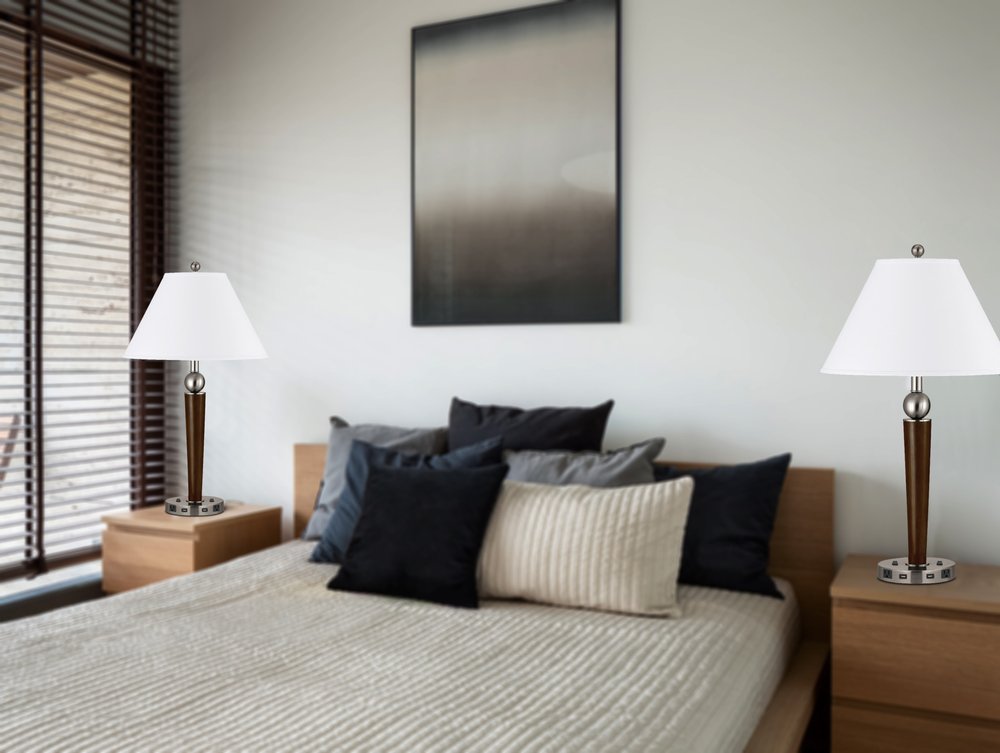 Add a bright anchor to your room with this 29-inch nickel metal two light geometric usb table lamp with white empire shade. A gorgeous nickel metal base brings just the right amount of pizzazz to this fabulous lamp. Includes a white linen, empire shaped shade, making this a fashionable piece that will complement most any interior. This standard table lamp is designed to provide general lighting to the area. Use this lamp anywhere and elevate the look of the whole space. The perfect lamp to create just the right natural and soothing light in your space. 29-inch H x 17-inch W x 17-inch D
