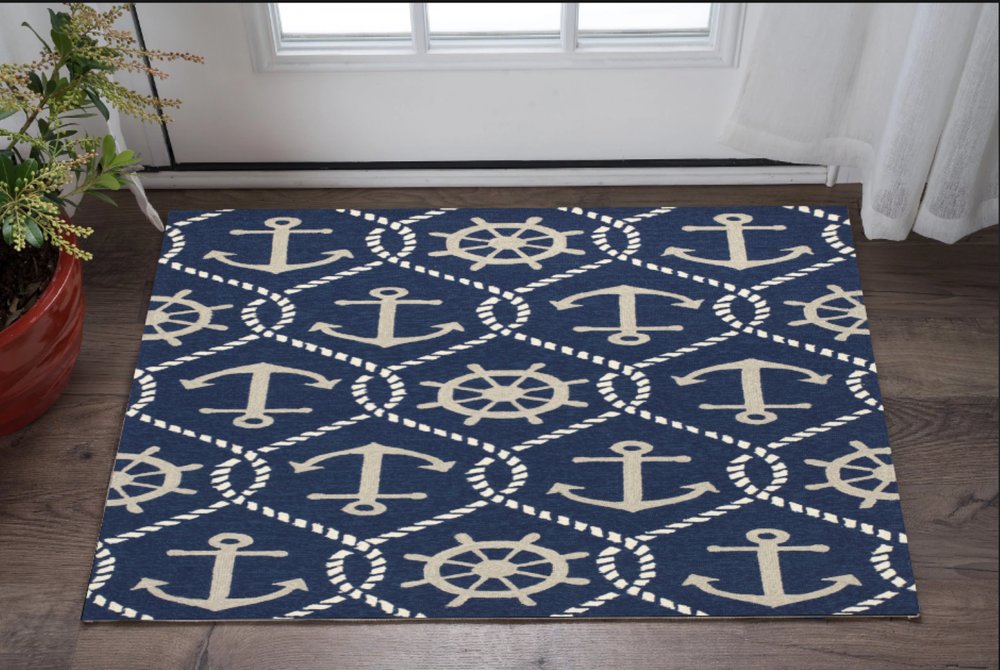 Add some artistry to your room with this 3-foot x 5-foot navy blue gold and white nautical handmade indoor outdoor area rug. This rectangle shaped rug features a nautical design that will work well both indoors or out. A classic shape marries with good looking design for your living room, hall, bedroom, porch, patio, or poolside. Ideal for outdoor spaces or high traffic areas with kids and pets, this rug is made from heavy duty polypropylene that is stain resistant to help repel water, dirt, and stains. Makes a great way to dress up your patio, porch, or poolside, but also works well as a durable and easy to maintain option in the kitchen, family room, or mudroom. 39-inch h x 63-inch w x 0.5-inch d.