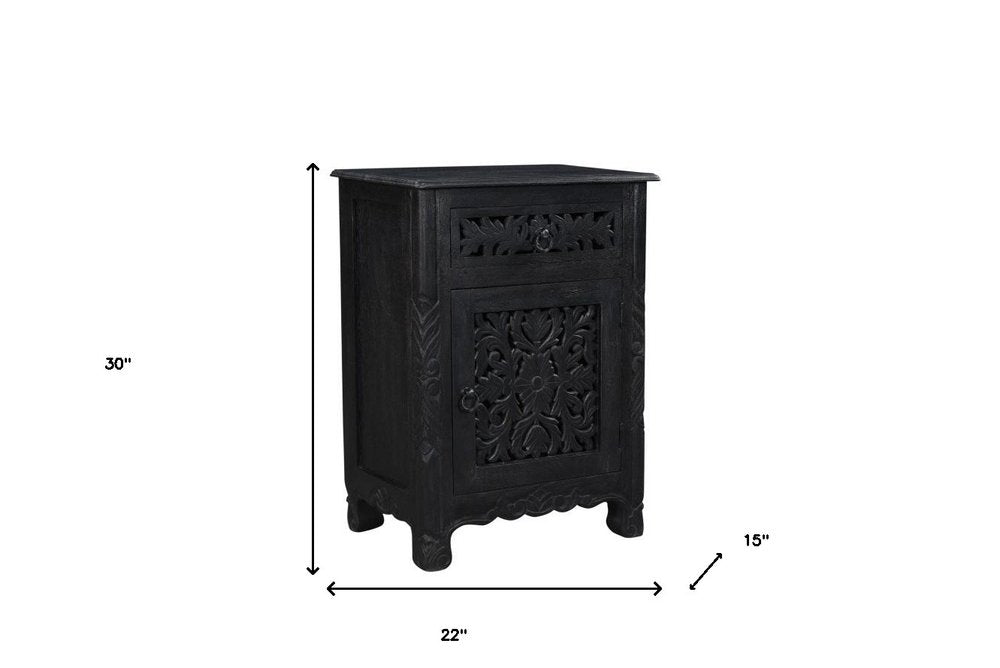 Good looking design and practical styling meet to form this 30-inch black solid wood distressed one drawer nightstand. Robust in design, the bed side table has been expertly crafted from solid wood. The easy open drawer allows you hidden storage to keep your essentials close at hand. An easy-access shelf gives you additional storage and display space. This piece is purposefully distressed to give a worn, rustic/vintage finish. The unsung hero of the bedroom, this nightstand is perfect for keeping a glass of water, lamp, alarm clock, jewelry, and more, close by and easily accessible. Nightstands are obviously great beside the bed but can be used just as easily to help battle clutter in your living room, hallway, office, or dining room. 30-inch h x 22-inch w x 15-inch d.