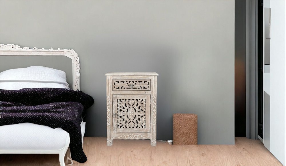 Give your room the look and feel of 5-star accommodations with this 30-inch distressed white one drawer carved floral solid wood nightstand. Sturdy and durable construction from solid wood ensures this trusty bedside table is built to last. Includes a drawer and cabinet to help keep your essentials close by and hidden. This piece is purposefully distressed and finished with a whitewash to give a worn, rustic/vintage finish. The unsung hero of the bedroom, this nightstand is perfect for keeping a glass of water, lamp, alarm clock, jewelry, and more, close by and easily accessible. 30-inch H x 22-inch W x 15-inch D