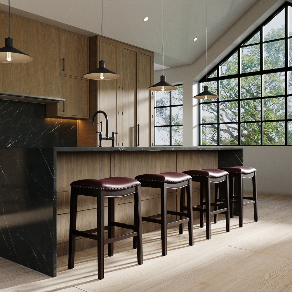 Bring a trendy bar vibe to your space, with this 31-inch dark red and espresso solid wood backless bar chair. The espresso coloration of the high quality solid wood base marries nicely with the dark red solid wood seat. A backless mixed with a rectangle shaped seat makes this chair both comfortable and fashionable. Designed with a footrest for comfort and convenience. 31-inch H x 20-inch W x 14-inch D