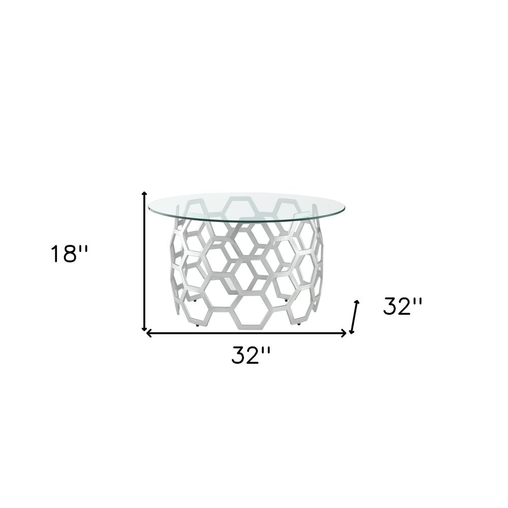 32" Clear And Silver Glass And Iron Round Coffee Table