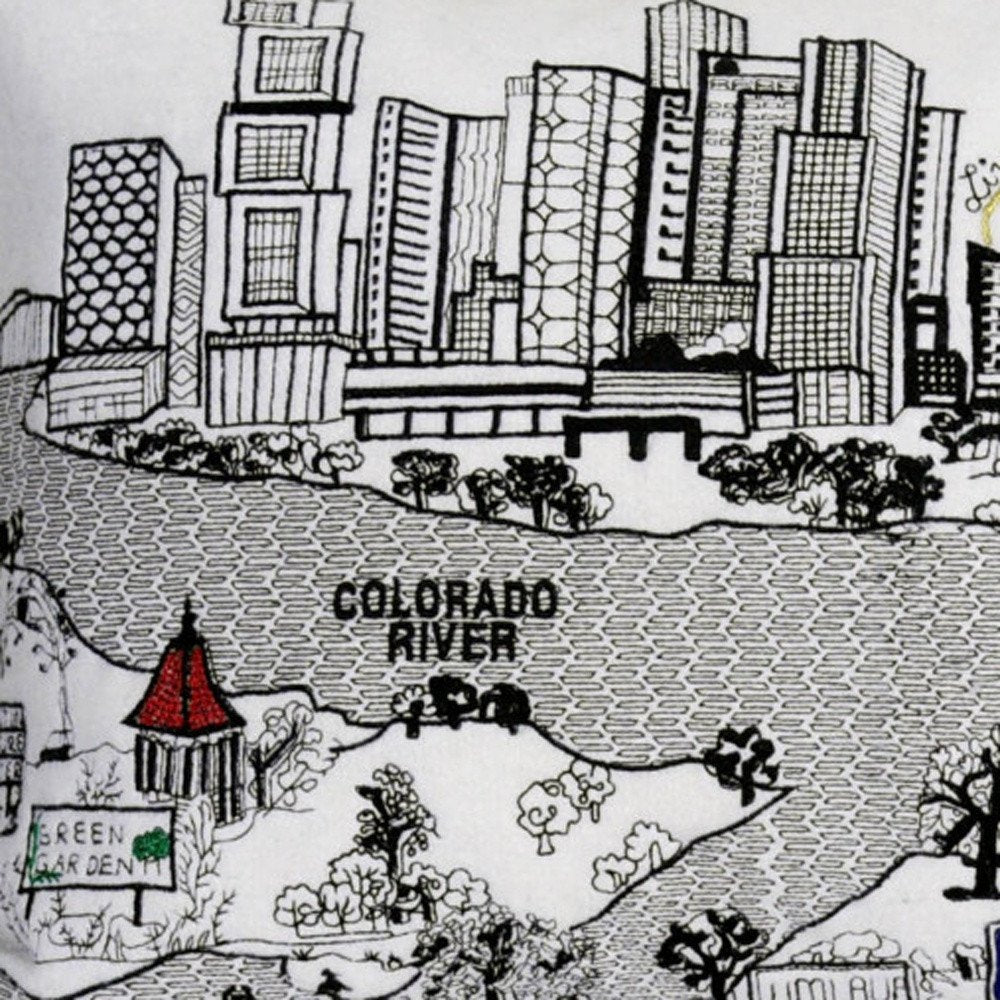 Showcase this famous city, with our Austin Daylight Skyline Queen Size Lumbar Decorative Pillow. The daylight view of Austin that includes the Colorado River and Lady Bird Lake, is picture perfect. The gorgeous art features many famous landmarks and references for this destination city, rendering a modern whimsical way to bring this iconic cityscape to life. Made of a wool/nylon blend, this high quality stitched decorative pillow features black on white embroidered artwork mixed with pops of color that highlight important and recognizable icons from this popular and bustling Texas city. This pillow makes a great gift, decorative accent and conversation piece. 14-inch H x 35-inch W x 4-inch D