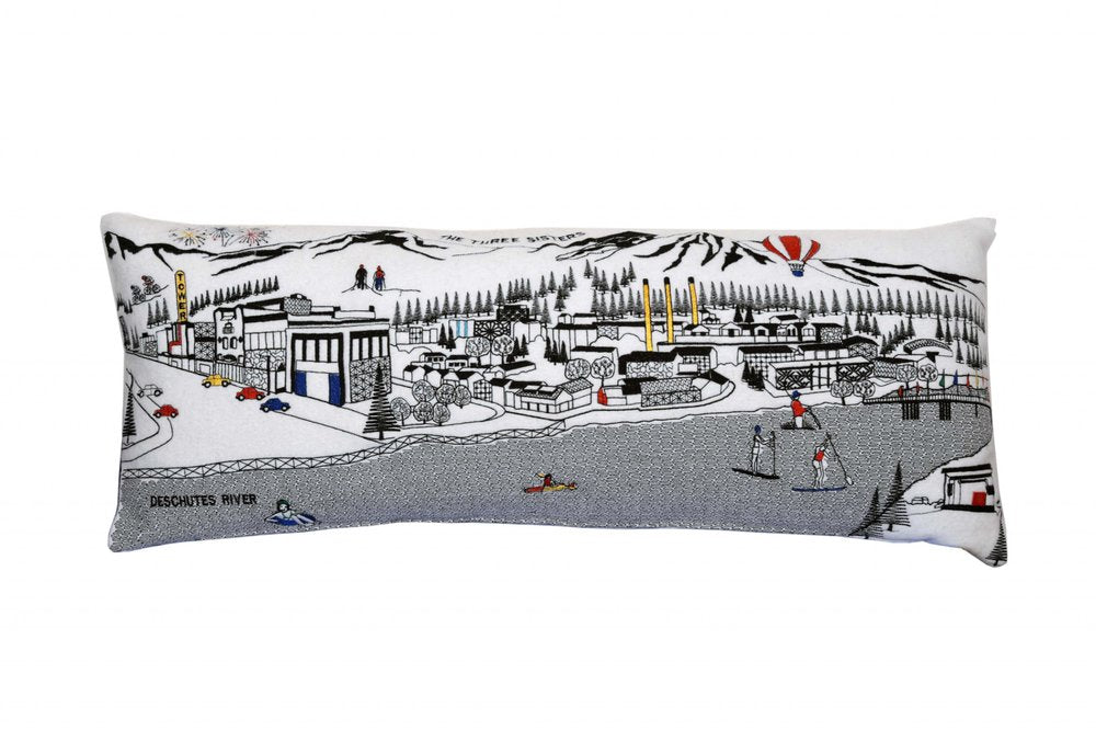 Showcase this famous city, with our Bend Daylight Skyline Queen Size Lumbar Decorative Pillow. The daylight view of Bend from the mighty Deschutes River that runs through it, is picture perfect. The gorgeous art features many famous landmarks and references for this destination city, rendering a modern whimsical way to bring this iconic cityscape to life. Made of a wool/nylon blend, this high quality stitched decorative pillow features black on white embroidered artwork mixed with pops of color that highlight important and recognizable icons from this popular Oregon city. This pillow makes a great gift, decorative accent and conversation piece. 14-inch H x 35-inch W x 4-inch D