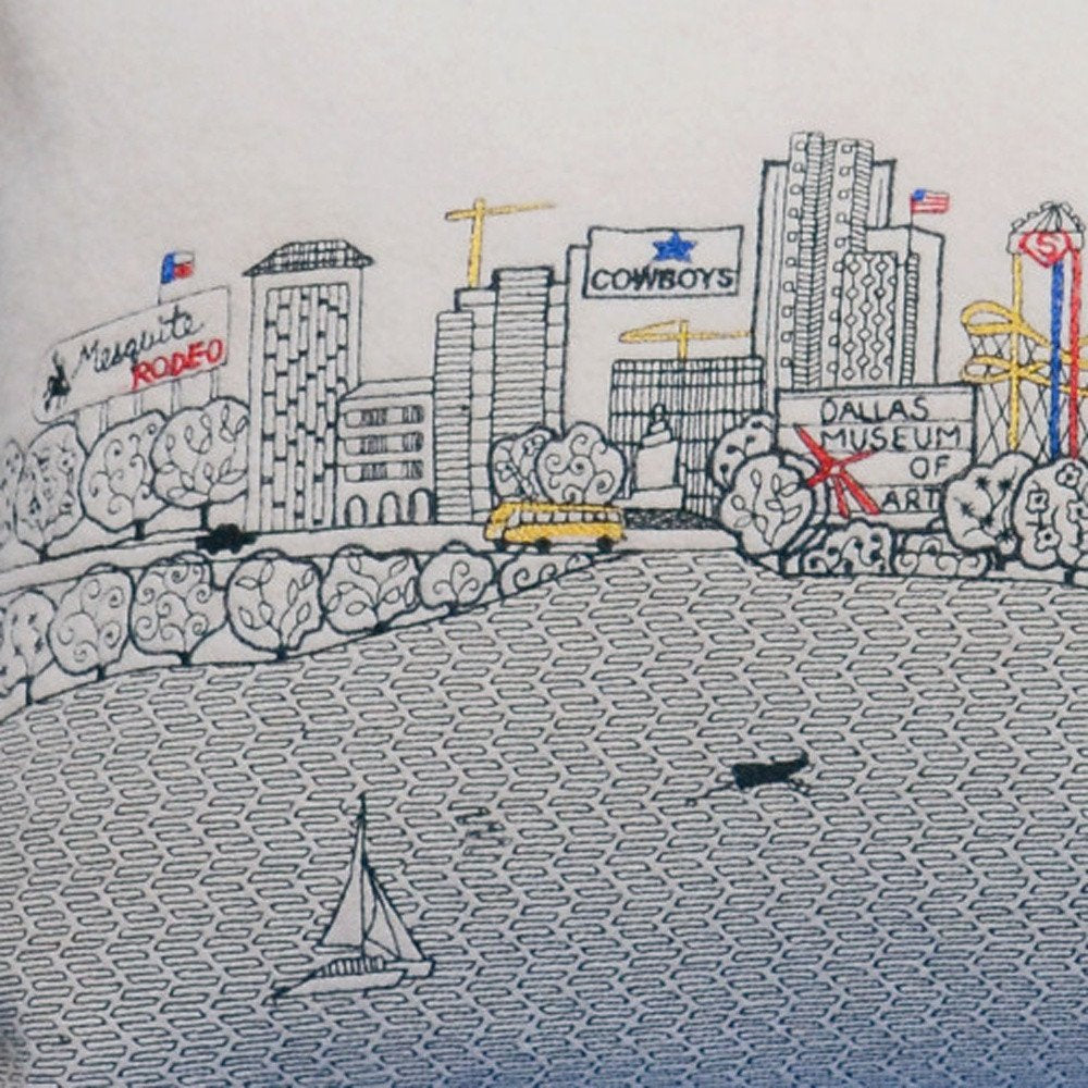 Showcase this famous city, with our Dallas Daylight Skyline Queen Size Lumbar Decorative Pillow. The daylight view of Dallas from the Trinity River, is picture perfect. The gorgeous art features many famous landmarks and references for this destination city, rendering a modern whimsical way to bring this iconic cityscape to life. Made of a wool/nylon blend, this high quality stitched decorative pillow features black on white embroidered artwork mixed with pops of color that highlight important and recognizable icons from this popular Texas city known for among other things, their beloved Cowboys NFL Team. This pillow makes a great gift, decorative accent and conversation piece. 14-inch H x 35-inch W x 4-inch D