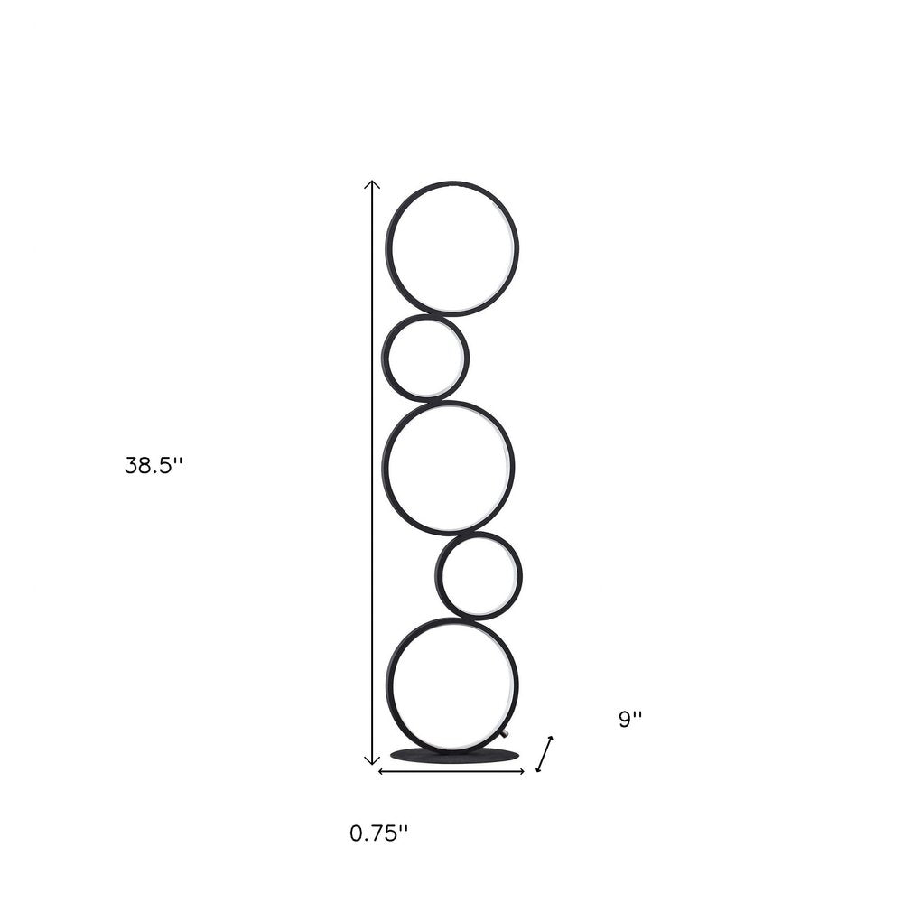 Truly a mix of design and functionality that doesn't compromise on style, this 39" matte black metal five circle geometric sculpture LED table lamp will be a great addition to your space. The lamp is made of sturdy metal in a unique abstract circular stacking tower. This contemporary table or desk lamp is designed to provide general lighting to the area. The light that this lamp throws is bright white and energy efficient. Perfect to add a contemporary flair to your space.38.5" H x 0.75" W x 9" D