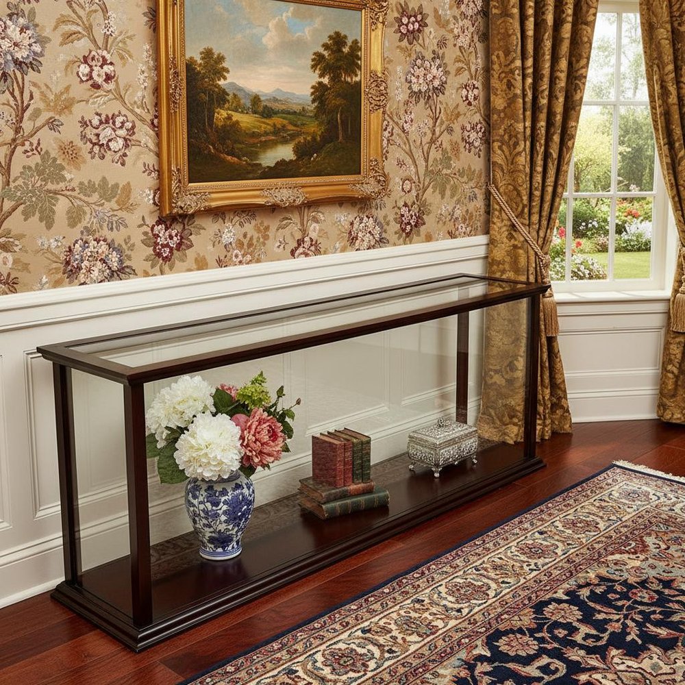 This 39" dark brown glass standard display stand will be the perfect addition to your dining or living space. Its a high quality piece, made from premium grade manufactured wood. Storage vessels don't have to be unsightly. Increase your storage space and the fashion quotient of your room with this hard wearing, versatile, and good looking cabinet. 16" H x 38.5" W x 9.5" D