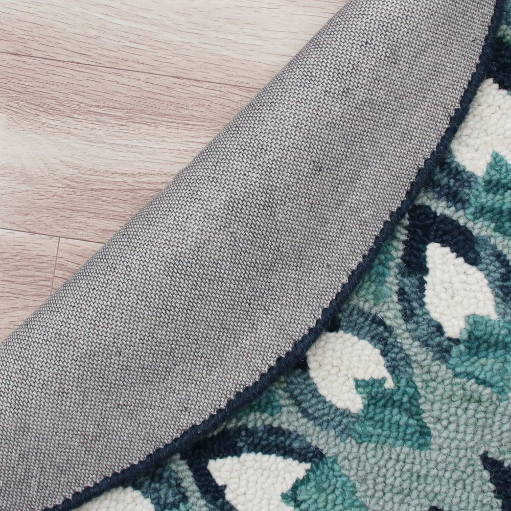 Flaunting an eye-catching design in a soothing color palette, this Round Blue and White Floral Feathers Area Rug is a piece of art on its own. The beautiful floral feathers in shades of blues transitioning from deep hues to the lighter ones look harmonizing while the hints of white add to visual contrast. This rug is Construction: 100% wool for added softness and durability, allowing it to last a long time and provide a cozy and inviting underfoot. The medium pile texture adds texture to the surface, making it an excellent accent for low to moderate traffic areas indoors. Induce a calm and relaxing ambiance into your place with this stunning area rug that is meant to spruce up any modern or traditional living space. 48”