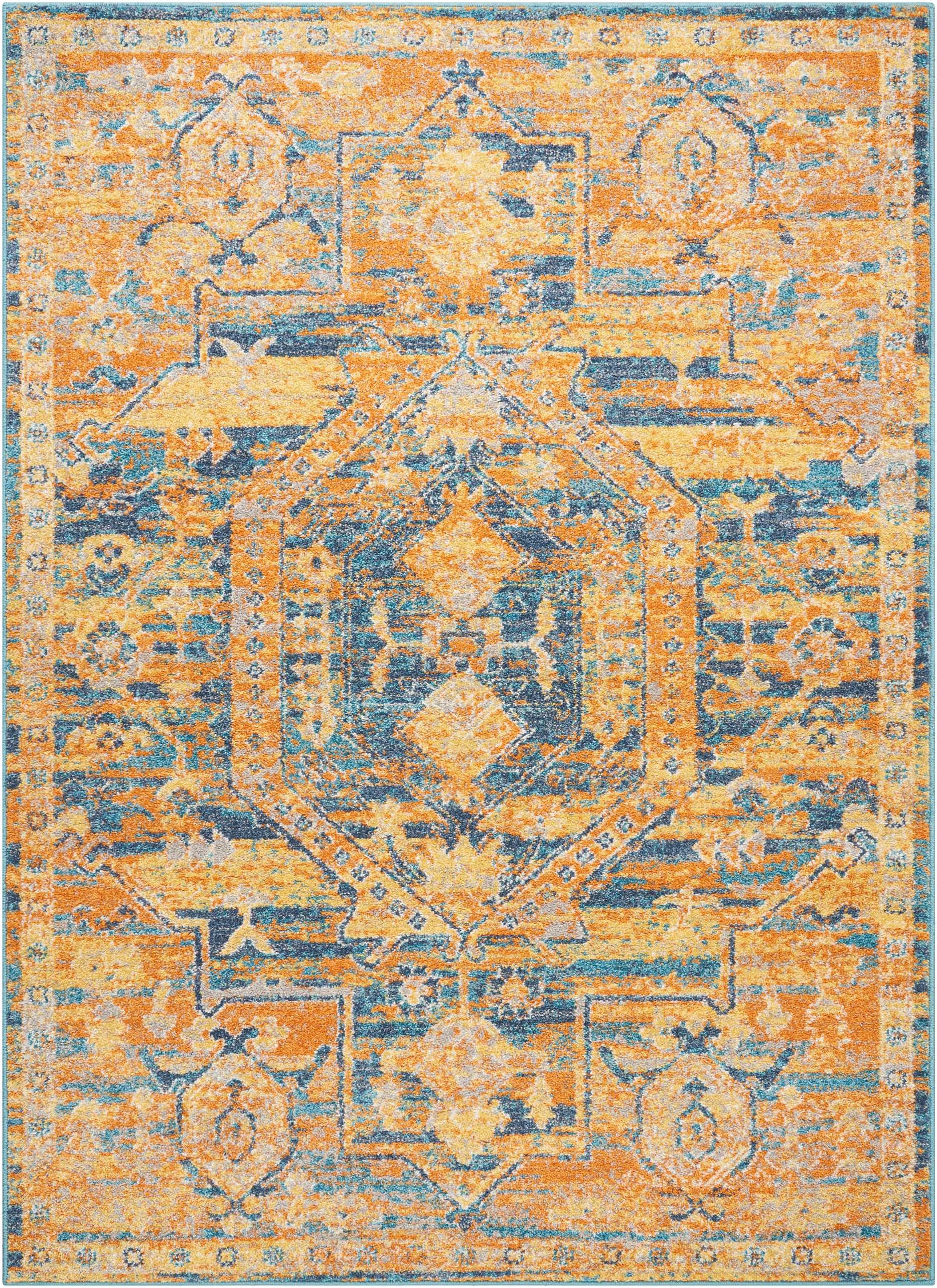 Add some artistry to your room with this 4-foot x 6-foot teal and gold medallion distressed area rug. Built to last, this rug crafted from polypropylene fibers is known for its durability and long lasting appeal. Rugs are a great way to showcase your style, hide imperfections, warm your home and reduce noise. This smaller sized, traditional styled rug is just what you need for your walkway, bedside, in front of door, cabinet, refrigerator, or chair. 45-inch h x 69-inch w x 0.5-inch d.