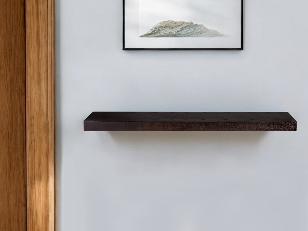 Add a touch of minimalist design combined with utility to any space in your home with this Espresso Wooden Floating Shelf. This shelf is made of manufactured wood and veneer and features a simple narrow rectangular design, that like the name implies, appears to be floating. The deep espresso brown finish on top allows the wooden grain and details to show through adding more depth to the overall look. This floating shelf is constructed in a way that makes it light weight allowing it to hang on any wall securely. You can use this shelf in your kitchen as extra storage, in your living room or bedroom as a picture shelf, or in your entryway to hold you keys, wallet, or letters. 1.97" H x 43.31" W x 10.24" D
