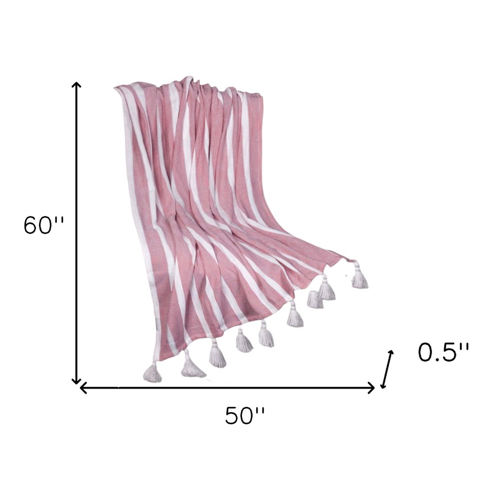 50" X 60" Pink and White Woven Cotton Striped Throw Blanket with Tassels