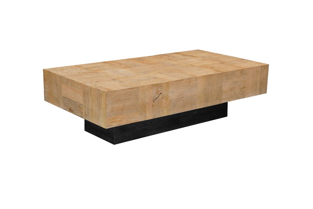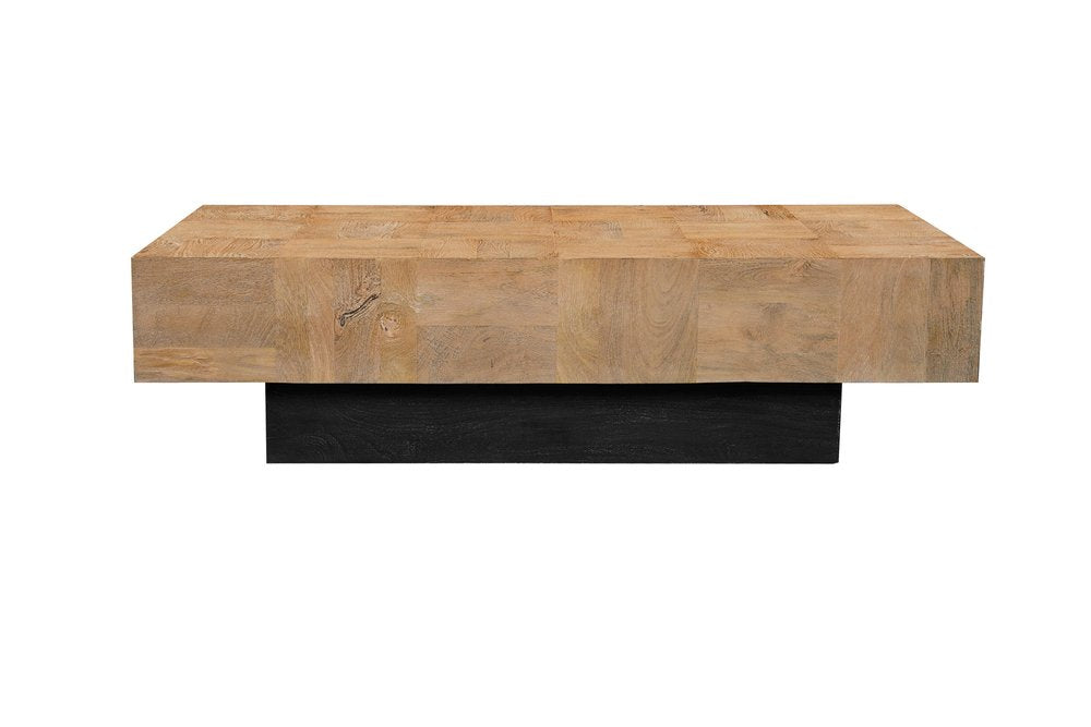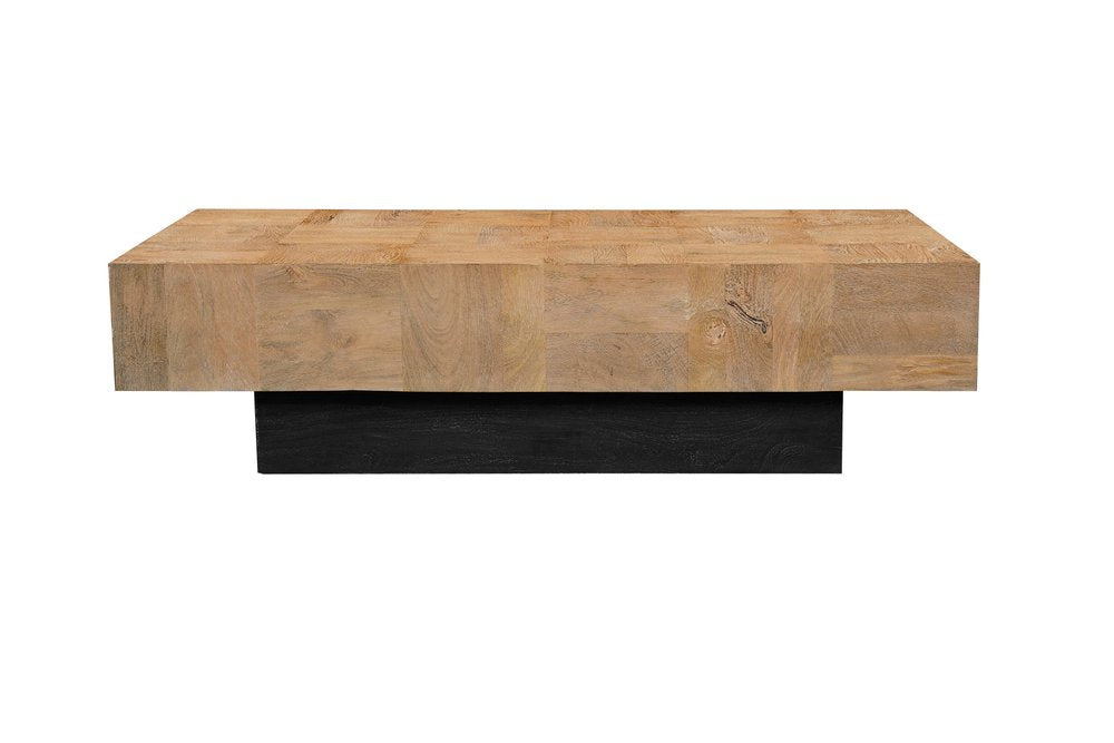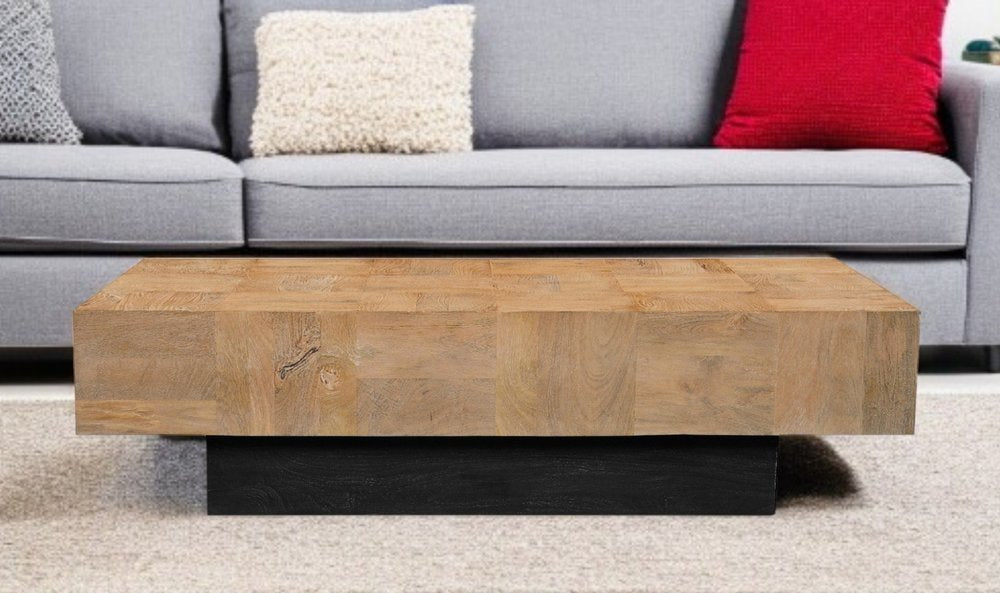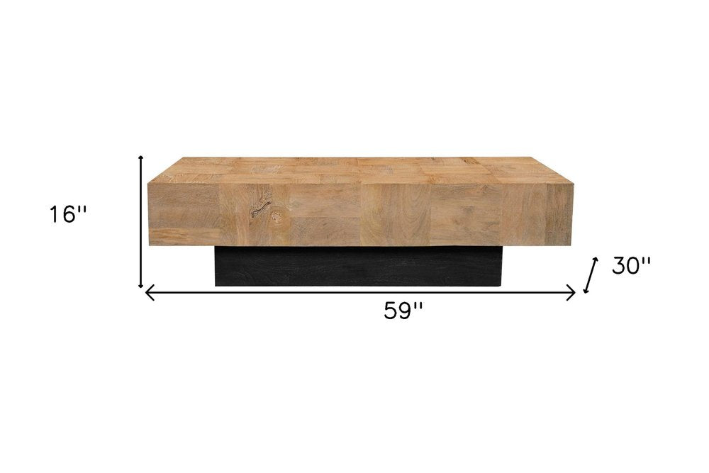 This stylish 59-inch natural and black solid wood block coffee table is not only practical, but good looking and built to last. Offering a modern chic two-tone color combination, the thick chunky solid top of this wood table is natural with lots of knots and grains, while the chunky solid base compliments it nicely in black. The purposefully washed and distressed finish gives this table an authentically rustic feel. This modern rectangular table will be a great accent in any room if you're looking for something that can fit into a living area, bedroom, or office, this coffee table is for you. 16-inch h x 59-inch w x 30-inch d.