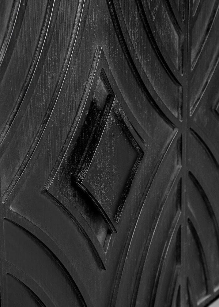 Storage vessels don't have to be unsightly. Increase your storage space and the fashion quotient of your room with this hardwearing and versatile sideboard. Crafted from a mix of solid and manufactured wood with distressing, this mid-century style sideboard features a beautiful carved geometric pattern. The charming charcoal and brown color scheme adds warmth to any space. This multi-functional practical piece of furniture seamlessly blends functionality with aesthetic appeal. 32.28-inch H x 60-inch W x 15.6-inch D