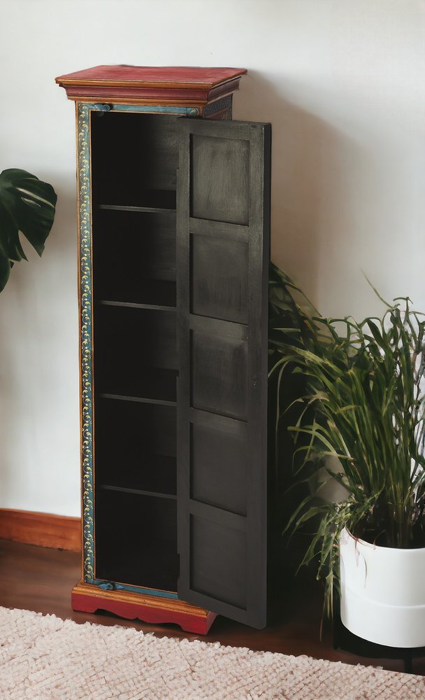 Dress up your dining room, living room, bedroom, or hallway with this gorgeous 60-inch red blue and gold hand painted accent cabinet. Its a high quality piece, made from a mix of solid and manufactured woods. Storage vessels don't have to be unsightly. Increase your storage space and the fashion quotient of your room with this hard wearing, versatile, and good looking cabinet. 60-inch H x 16-inch W x 12-inch D