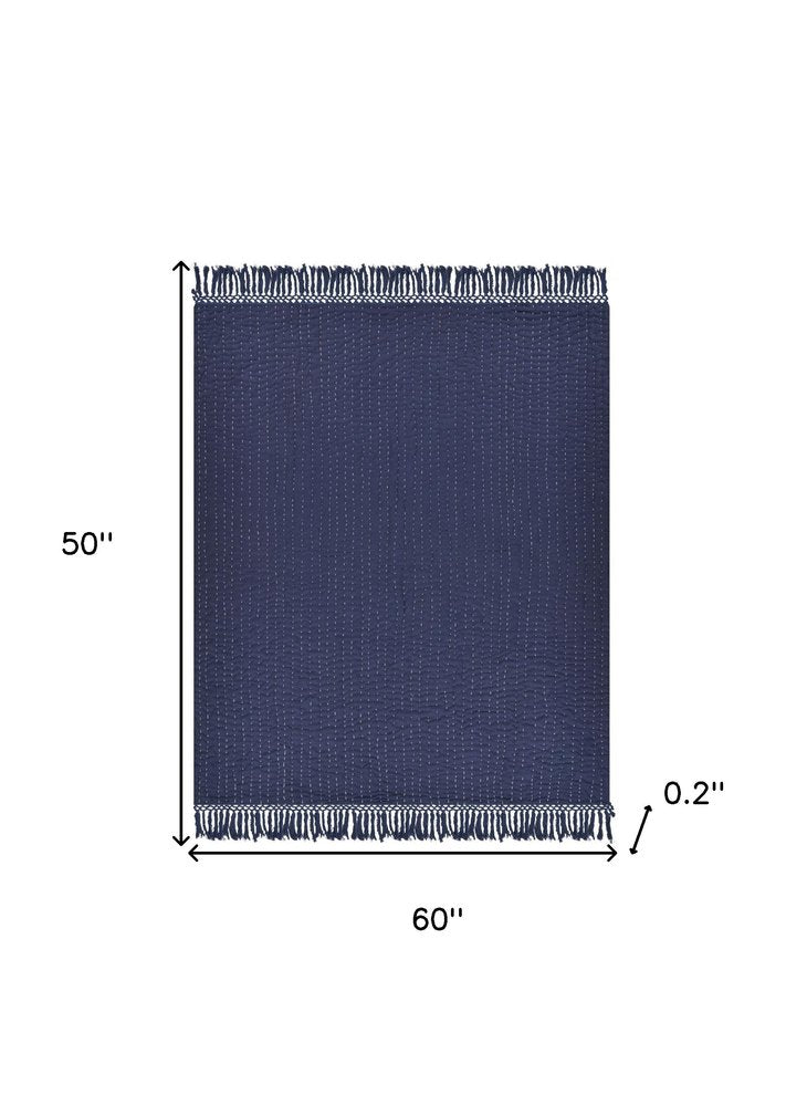 60" X 50" Blue Kantha Cotton Throw Blanket with Embroidery