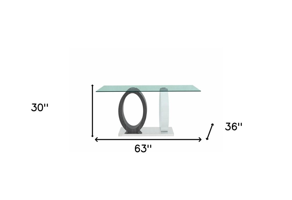63" Clear Gray and White Glass And Metal Double Pedestal Base Dining Table