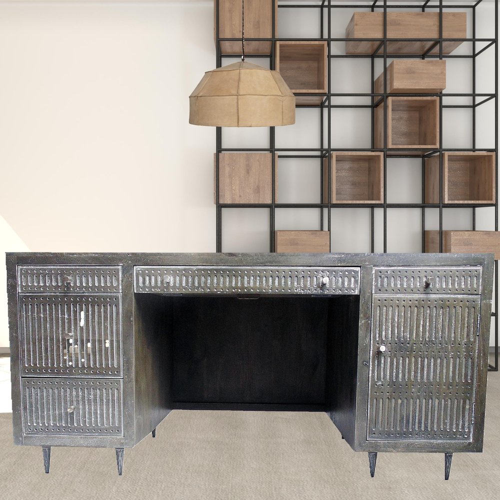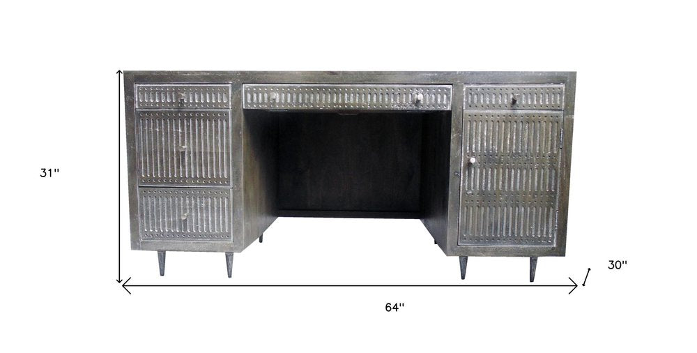 This 64" brown and silver mango solid wood executive desk with five drawers will help to turn your office space into an executive suite. With a classic shape and style, this well made rectangular desk is a stylish way to keep your office space looking good. Multiple drawers give this desk plenty of hidden storage for your office essentials. Built to last, this sturdy desk is designed for comfort and efficiency for years to come. 31" H x 64" W x 30" D