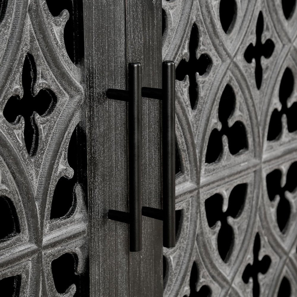 Storage vessels don't have to be unsightly. Increase your storage space and the fashion quotient of your room with this hard-wearing, versatile, and good-looking manufactured wood sideboard. Featuring coat/paint distressing for a modern style, this black sideboard comes with shelves and open storage to keep your items organized. The wood scrollwork door design adds a touch of elegance while providing functionality to this stylish and practical piece of furniture. 32.3-inch H x 64.6-inch W x 15.6-inch D