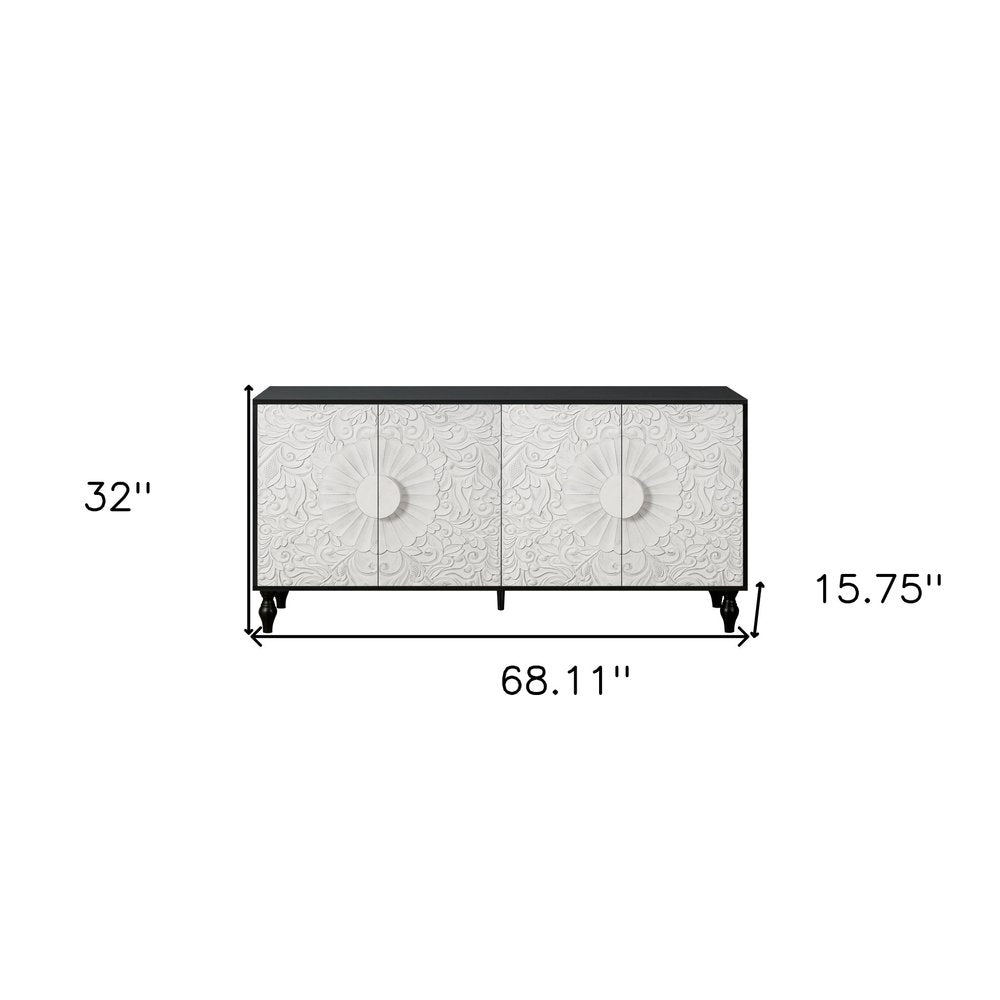 68" Black and White Distressed Carved Floral Sideboard with Four Doors