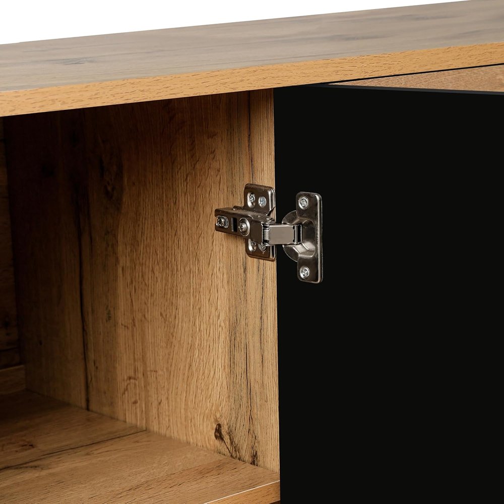 Storage vessels don't have to be unsightly. Increase your storage space and the fashion quotient of your room with this hard-wearing, versatile, and good-looking manufactured wood sideboard. Featuring coat/paint distressing for added character, this modern sideboard in a natural color showcases carved geometric textural detailing, while offering ample storage with shelves and open storage. The wood scrollwork door design adds a touch of elegance to this stylish piece that seamlessly combines form and function for your living space. 32-inch H x 68.11-inch W x 15.75-inch D