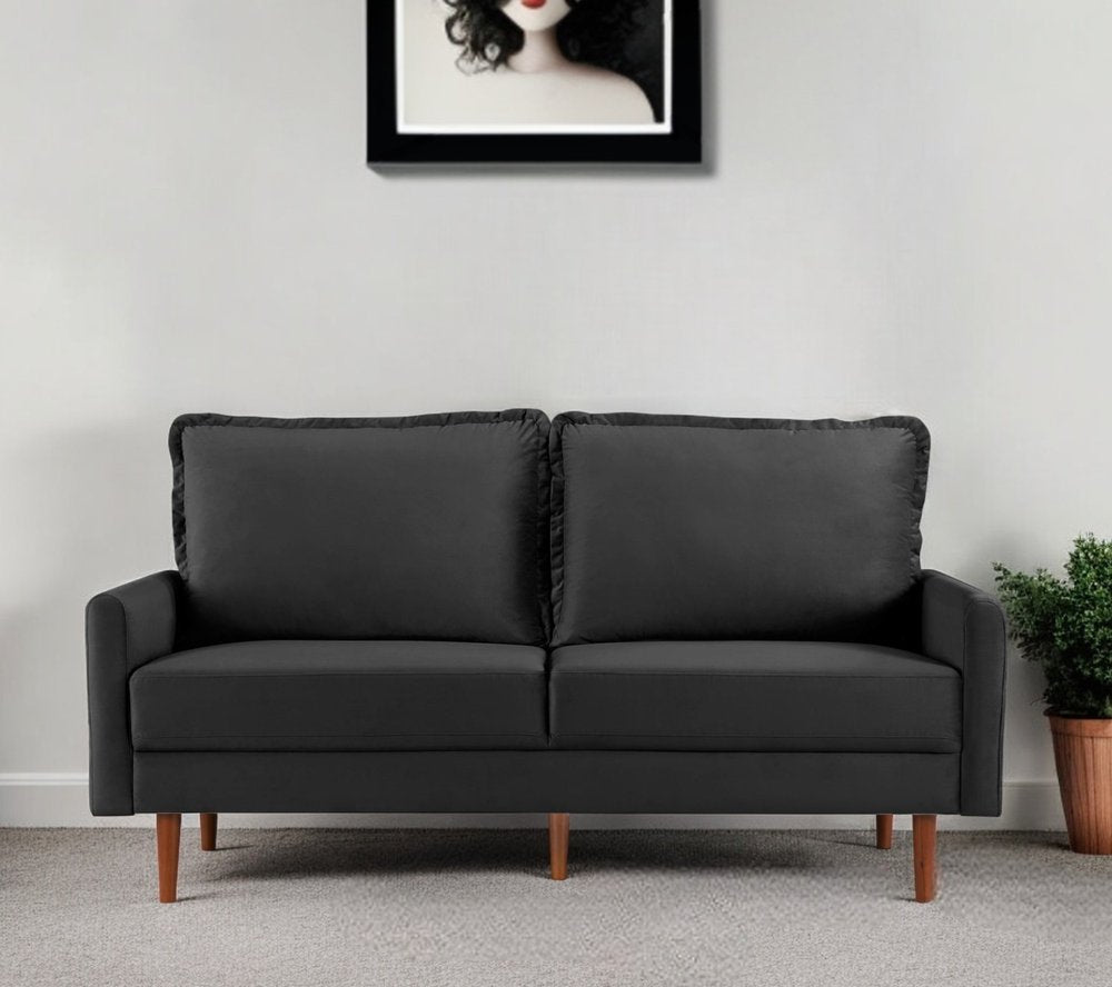 Transform your home's interior with this luxurious 69-inch black velvet sofa with dark brown legs. This solid color standard is made from sturdy and resilient velvet that has a warm and rich look and is a super soft and comfortable to the touch. Solid colors give you lots of decorative options and are easy to work into your decor scheme. Pocket spring construction gives this piece strong support and makes it comfortable to sit even for long periods of time. Track arms offer a comfy place to rest. Dark brown solid wood legs effortlessly elevate the room and add a touch of contemporary design. A great showpiece for your room, this sofa is a must have. 39-inch H x 69-inch W x 32-inch D