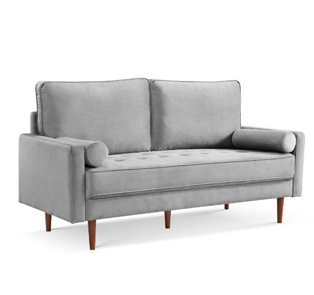 Designed for comfort and good looks, this 69-inch gray velvet sofa and toss pillows with dark brown legs is a great option to anchor your space. With a warm and rich look to it, this solid color standard is upholstered in velvet that is designed to be super soft to the touch, sturdy and resilient. Solid colors give you lots of decorative options and are easy to work into your decor scheme. Pocket spring construction gives this piece strong support and makes it comfortable to sit even for long periods of time. Track arms offer a comfy place to rest. The tufted stitching pattern adds visual interest and fine designer detailing. Dark brown solid wood legs effortlessly elevate the room and add a touch of contemporary design. A great showpiece for your room, this sofa is a must have. 37-inch H x 69-inch W x 32-inch D