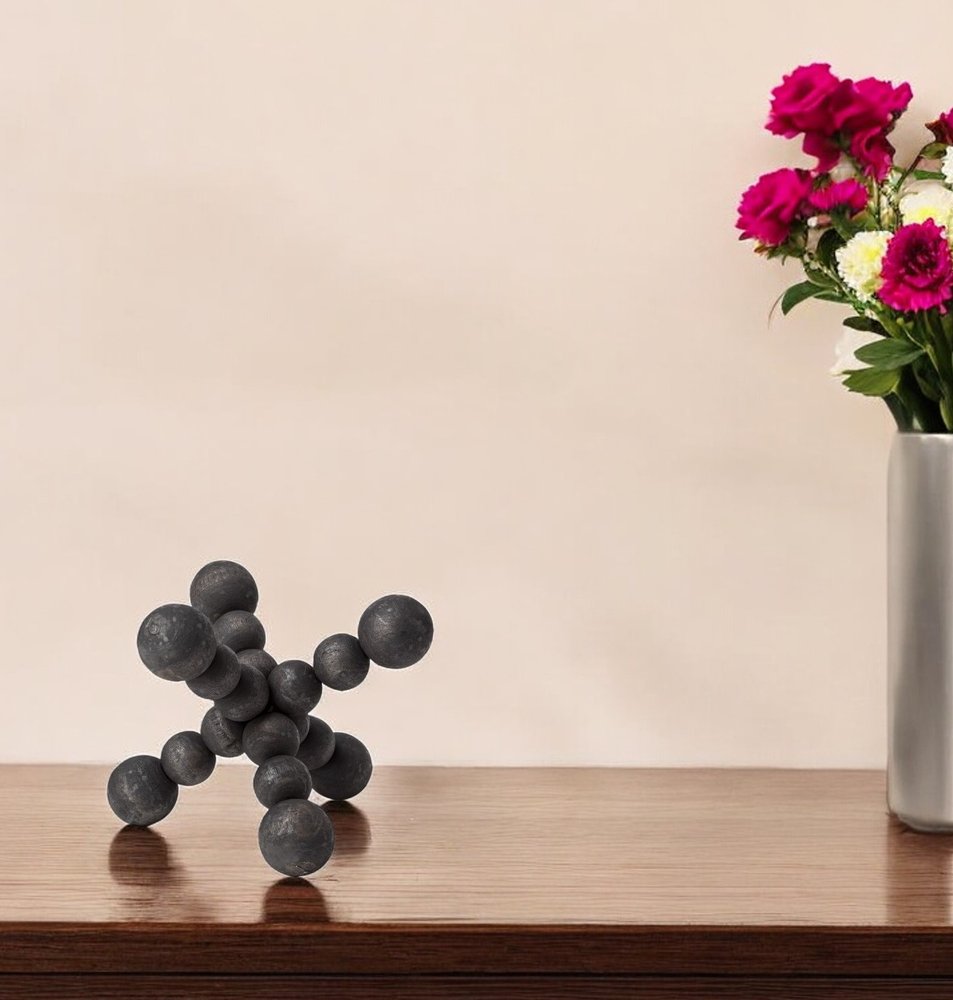This Petite 7" Black Beaded Wooden Decorative Jack is the perfect way to add some minimal contemporary design to your home. This decor piece is made from solid wood and features three rods that intersect at two different points. The rods have different sized round shapes that are attached together. The matte black rustic finish of this decor piece fits in perfectly with the minimal look and will elevate any space you use it in. You can use this decor piece anywhere in your home without worrying about any clashing colors. You can use this unique decor piece in conjunction with other similar piece or different colored geometric pieces and it will look great nonetheless. 7" H x 7" W x 7" D