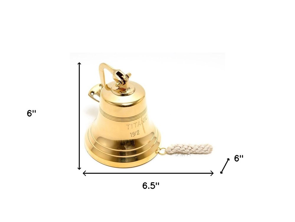 Bring some sizzle to your space with this eye-catching 7-inch gold metal hand painted 1912 rms titanic bell 6-inch model bell. This charming decorative accent is expertly made of high grade metal in a gold coloration. It's a perfect addition for those who love an up-to-the-minute look and feel. 6.5-inch h x 6-inch w x 6-inch d.