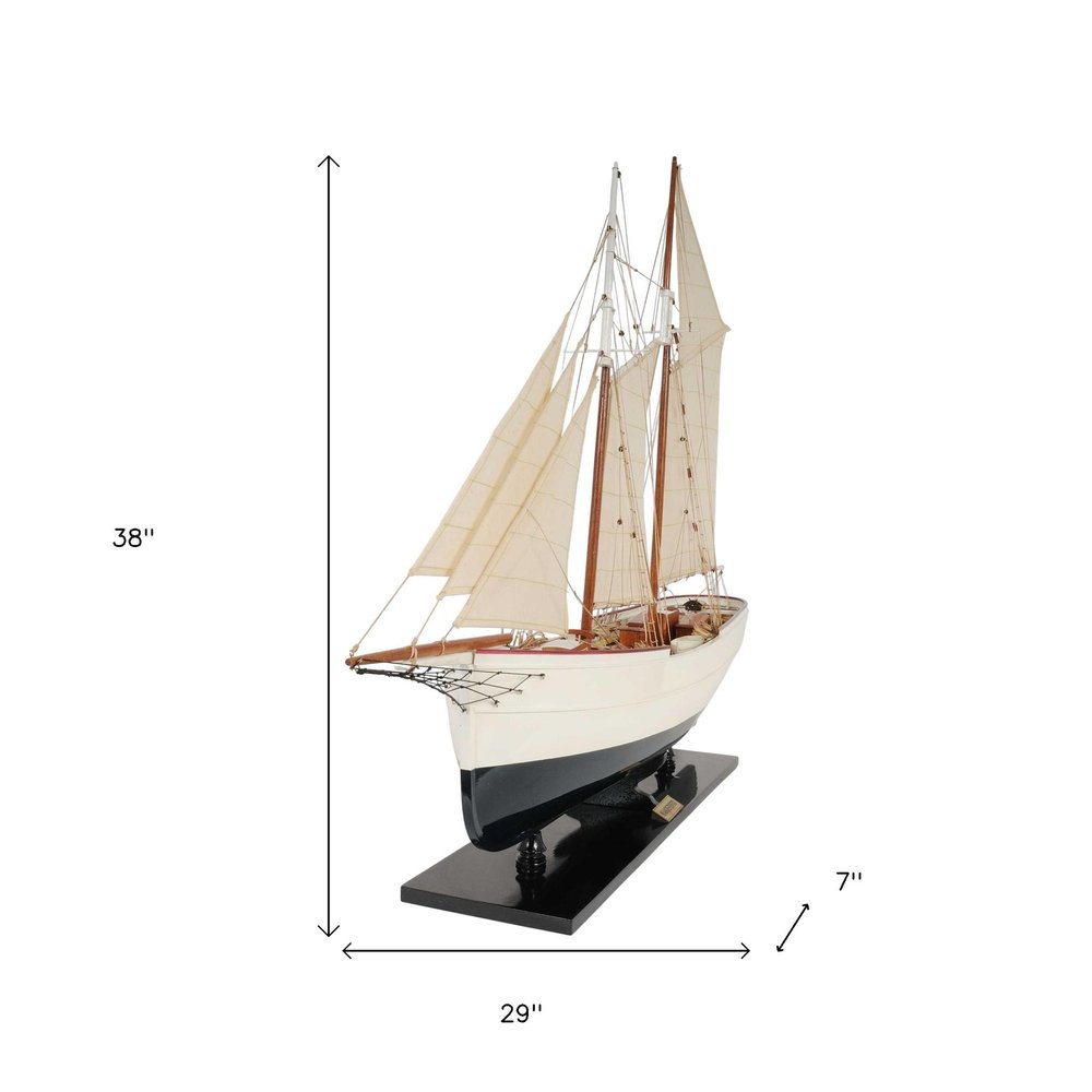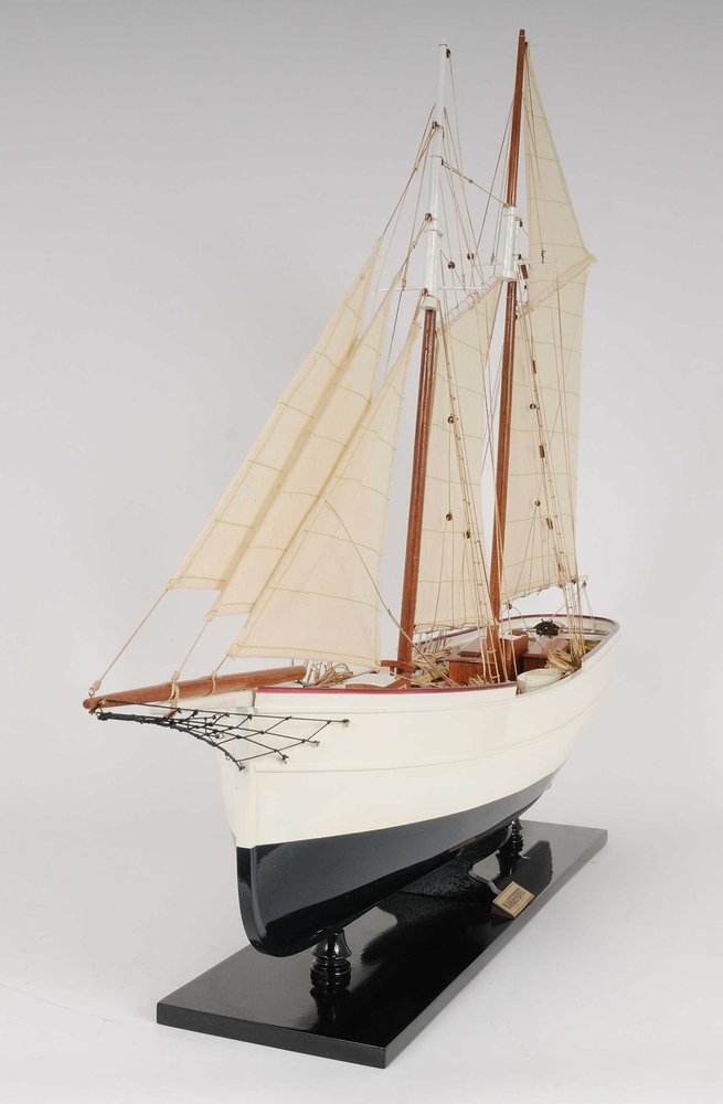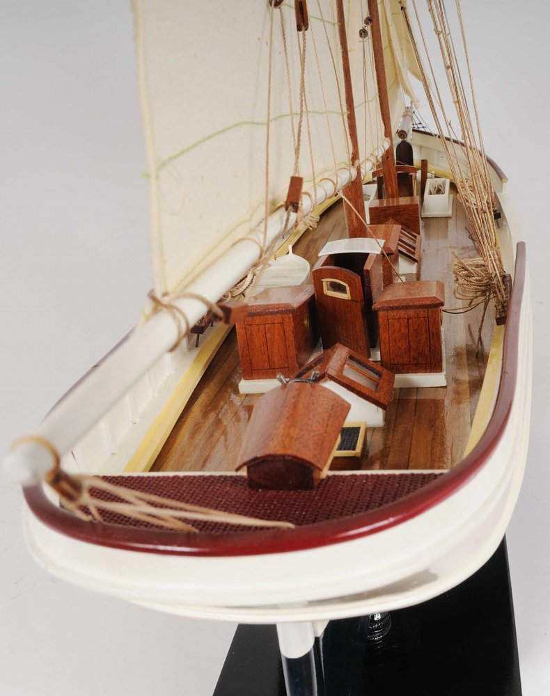 This is Museum-quality, Fully Assembled edition of the Wanderbird. The model is 100% hand built from scratch using plank on frame construction method. Our master craftsmen have spent more than 100 hours to finish it. Made of Mahogany and painted in white and very dark blue(closer to black). This replicas magnificent details include metal steering wheel, skylight, deck houses, advanced intricate rigging, full cloth sails with detail stitching, wood inlay deck and many more. Comes on a solid wood base, with metal nameplate.