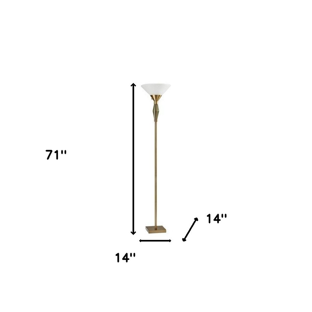 With this 71-inch brass light changing torchiere floor lamp with white fabric cone shade you bring design along with some warm ambient lighting to your space. The lamp is made of sturdy metal and features a brass color. The brass base coloring infuses a warm and rich tone to your space. The lamp shade itself has a cone shape and is made of fabric, which makes it a perfect choice. Add a soft warm glow to your space with this classic torchiere styled lamp. A straight pole extends upwards from a single base while the scooped shade shape refracts light upward and outward much like it's name sake,a torch. High quality design makes this a great lamp for not only lighting, but accenting a room with style. It is perfect for virtually any decor. 71-inch h x 14-inch w x 14-inch d.