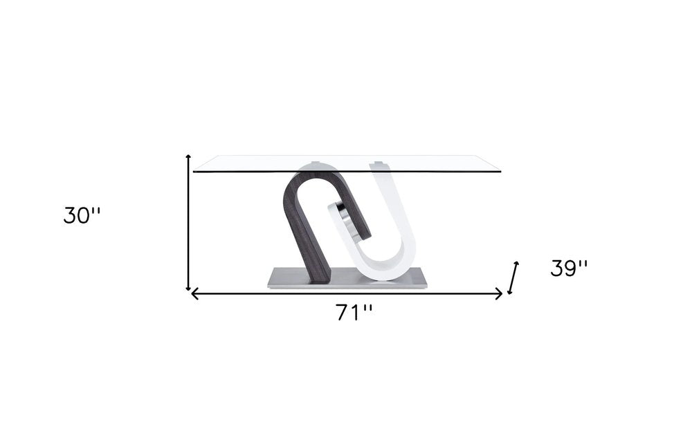 Make a statement with the 71-inch clear and white and gray glass and stainless steel pedestal base dining table and infuse a dash of character and personality into your space. Quality construction from the white and gray stainless steel base combines with clear glass of the top to give this table a fresh and updated two-tone look. Add a touch of modern design to your space with this easy to wipe clean glass top dining table. A beautiful pedestal base adds some dimension and elegance to your dining. Seat up to 6 family and friends around your new dining table. This table is the sturdy, reliable and stylish answer to your dining room needs. This eye-catching dining table is ready for you to enjoy breakfast for one or entertain your guests. 30-inch H x 71-inch W x 39-inch D