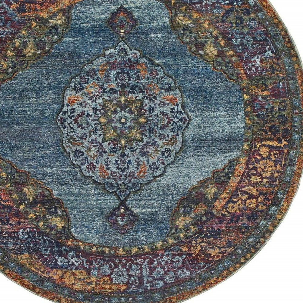 8' Blue and Beige Round Oriental Power Loom Area Rug