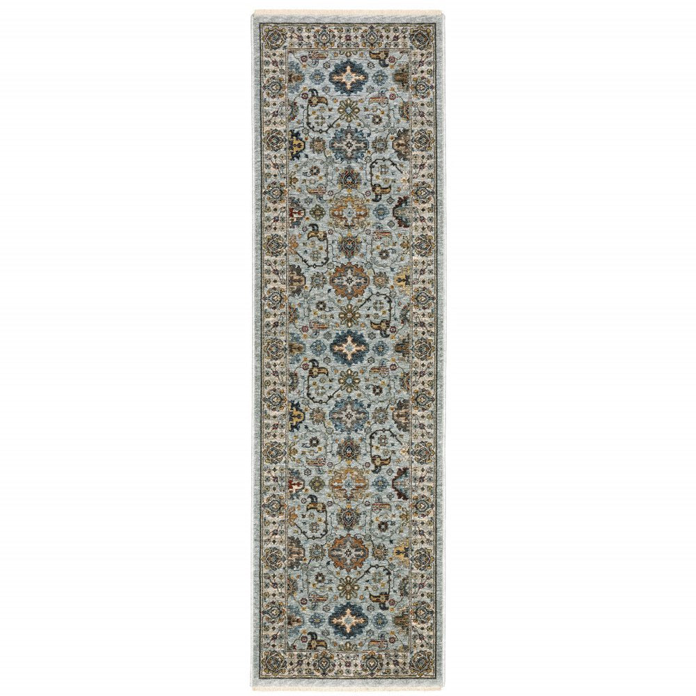 8' Blue And Ivory Oriental Power Loom Runner Rug With Fringe