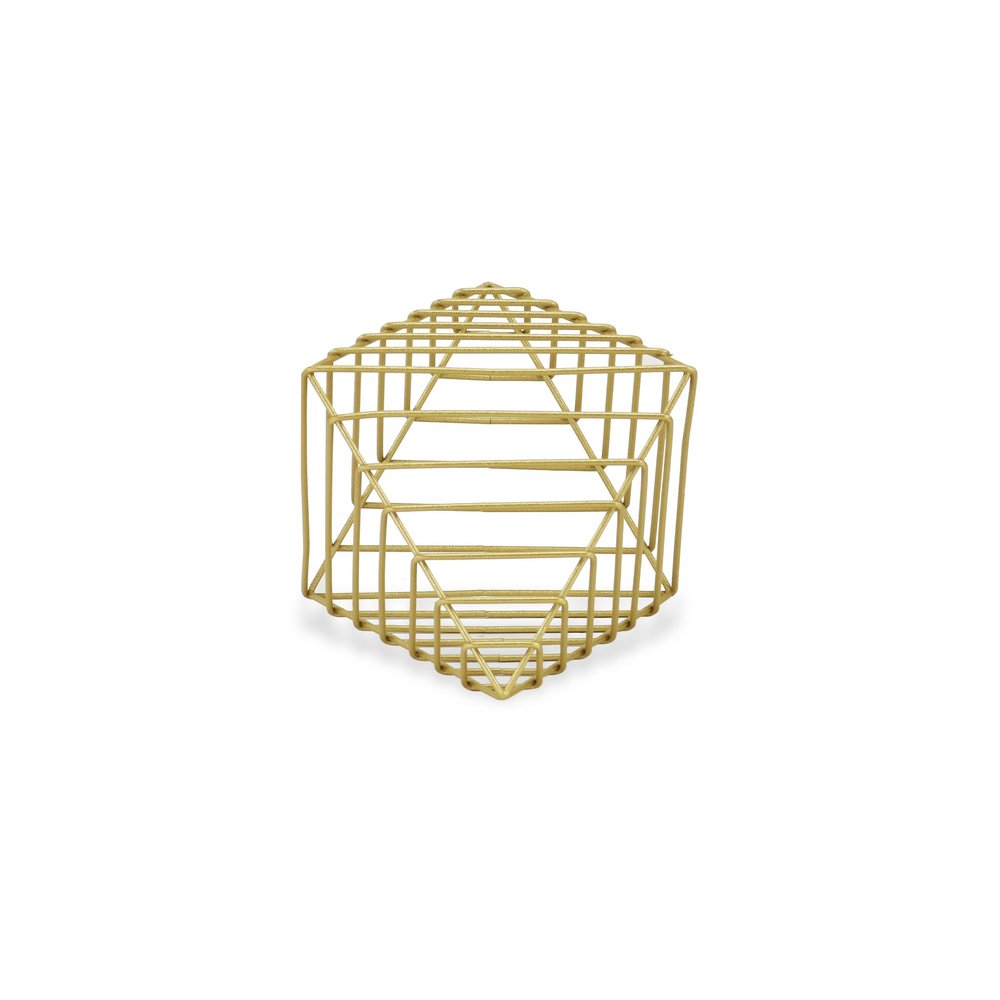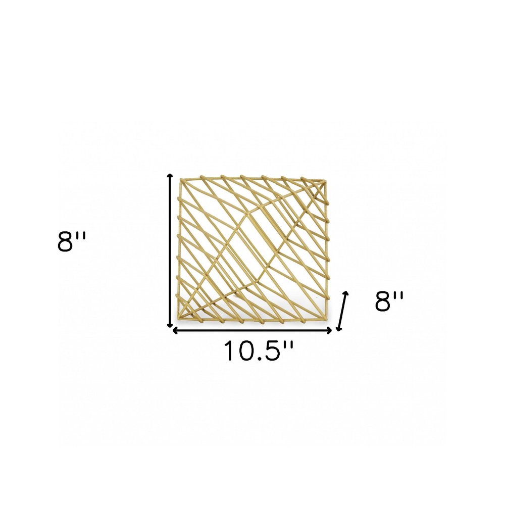 This Gold metal modern abstract tabletop sculpture is the perfect way to add a geometric accent piece to any space in your home. This piece is made of metal and is colored to a soft gold finish. The design features a base square shape which has a long diamond in the middle of it. The base shape is covered in thin metal strips that run from the front to the back creating a solid piece. You can use this decor piece on your bookshelf, in your living room, in your entryway, or as a fancy paper weight as well. 8-inch H x 10.5-inch W x 8-inch D