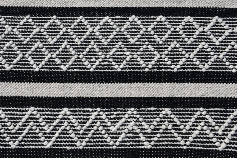 Set an inviting tone in your space with this 8-foot x 10-foot black and white wool geometric hand loomed area rug. This rectangle shaped rug features a geometric stripe design in black and white to give it visual interest. A classic shape marries with good looking design for your space while the chic coloration of this rug infuses an updated and modern vibe into your space. Crafted by skilled artisans, this hand loomed rug is genuine and unique. No two will be exactly alike. Area rugs help to give warmth and sense of home to your space. 96-inch H x 120-inch W x 1-inch D