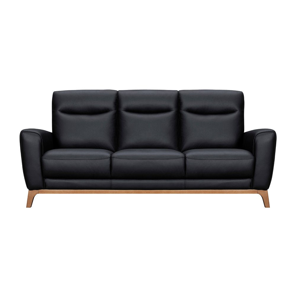 Superior construction from fabulously soft and high grade leather gives this 83-inch black leather sofa with brown legs a leg up on the competition. The premium leather used makes your lounging luxuriously comfortable and adds an elegant appeal to your space. Solid colors give you lots of decorative options and are easy to work into your decor scheme. Web suspension construction gives this piece strong support and makes it comfortable to sit even for long periods of time. Square arms offer a comfy place to rest. A great showpiece for your room, this sofa is a must have. 39-inch H x 83-inch W x 38-inch D