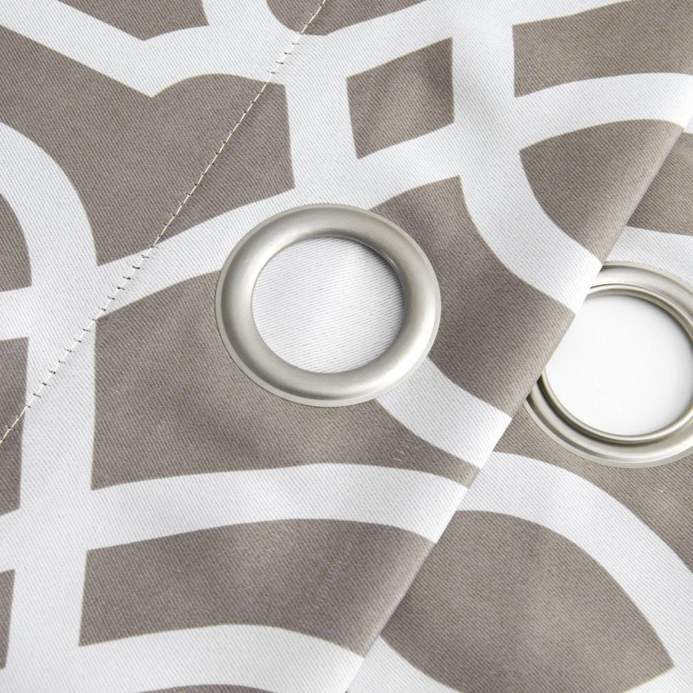 Enhance the look of your windows with this 84-inch taupe trellis black out window curtain panel. Perfect for adding a touch of contemporary style to any room, this single panel is designed to block out unwanted light. Made from high-quality polyester, it features a beautiful taupe and white color combination that will effortlessly complement your existing decor. Measuring 54 inches in width and 84 inches in length, this panel is the ideal choice for any standard-sized window. Bring function and style together with this blackout curtain panel, providing privacy and a darkened room for optimal relaxation. 84-inch H x 54-inch W x 1-inch D