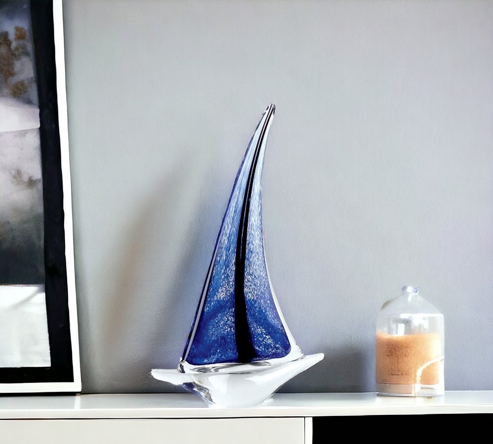 Add an air of fashion to your room and rejuvenate the space with this 9-inch clear and blue murano glass modern abstract tabletop sculpture. High-quality murano glass used in this clear and blue sculpture is both good looking and hard wearing. A perfect decorative addition for anyone who loves a stylish look and feel. 9-inch H x 3-inch W x 13.5-inch D