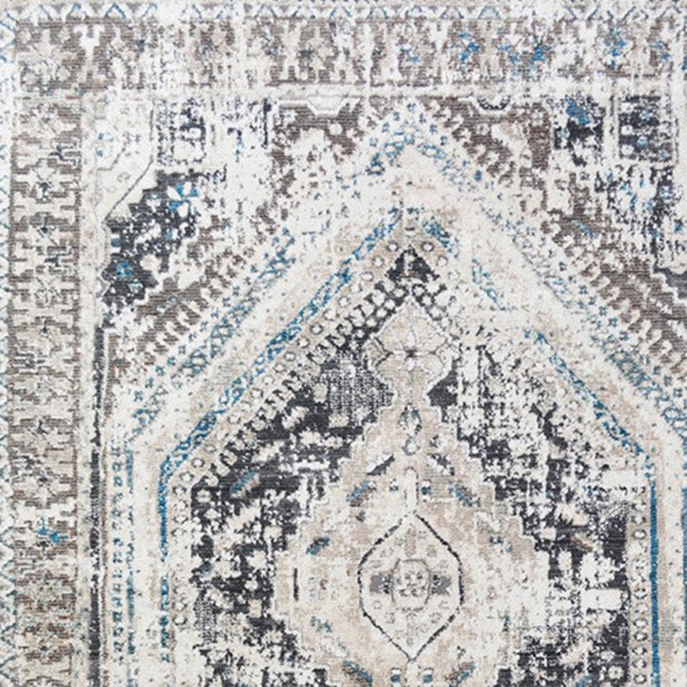 Add great coloration and comfortable texture to your space with this 9-foot x 13-foot gray beige and blue geometric distressed area rug with fringe. This rectangle shaped rug features a geometric design in gray beige and blue to give it visual interest. A classic shape marries with good looking design for your space ideal for spaces with kids and pets, this rug is stain resistant to help repel stains and spilled liquids. Tassel ends bring a timeless and fashionable look to your interior. Place this area rug against a hardwood or tile floor and it will enliven your living space with style and sophistication. 110-inch H x 150-inch W x 0.39-inch D