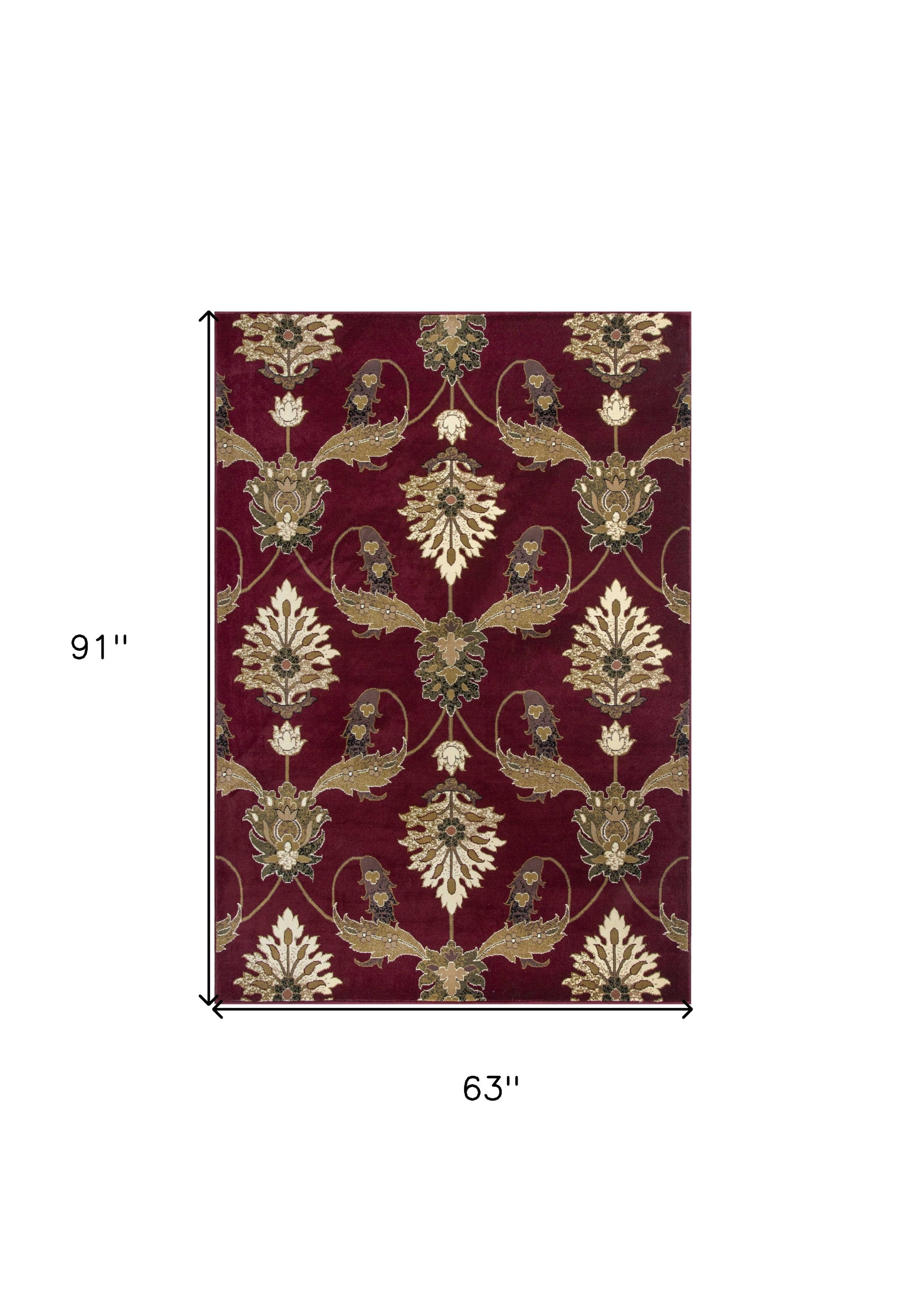 7' Red Beige And Brown Floral Vines Octagon Rug