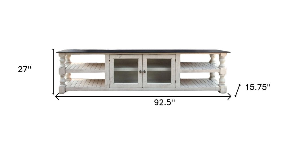 Practical, space saving, and good looking, this 93" gray and ivory solid wood cabinet enclosed storage distressed tv stand is a versatile media storage solution. Curated from high quality solid pine wood, this console is natural, beautiful, and built to last. Due to the genuine nature of the wood some natural wood knots, and grain and color variations may occur. I To add to the versatility, this piece features open non-concealed storage that can be used for not only storage but display as well. A cord cut out hole is ideal for wire and cable managment to keep your space looking tidy. Ideal for tv placement and storage in your living room, bedroom or office. 27" H x 92.5" W x 15.75" D