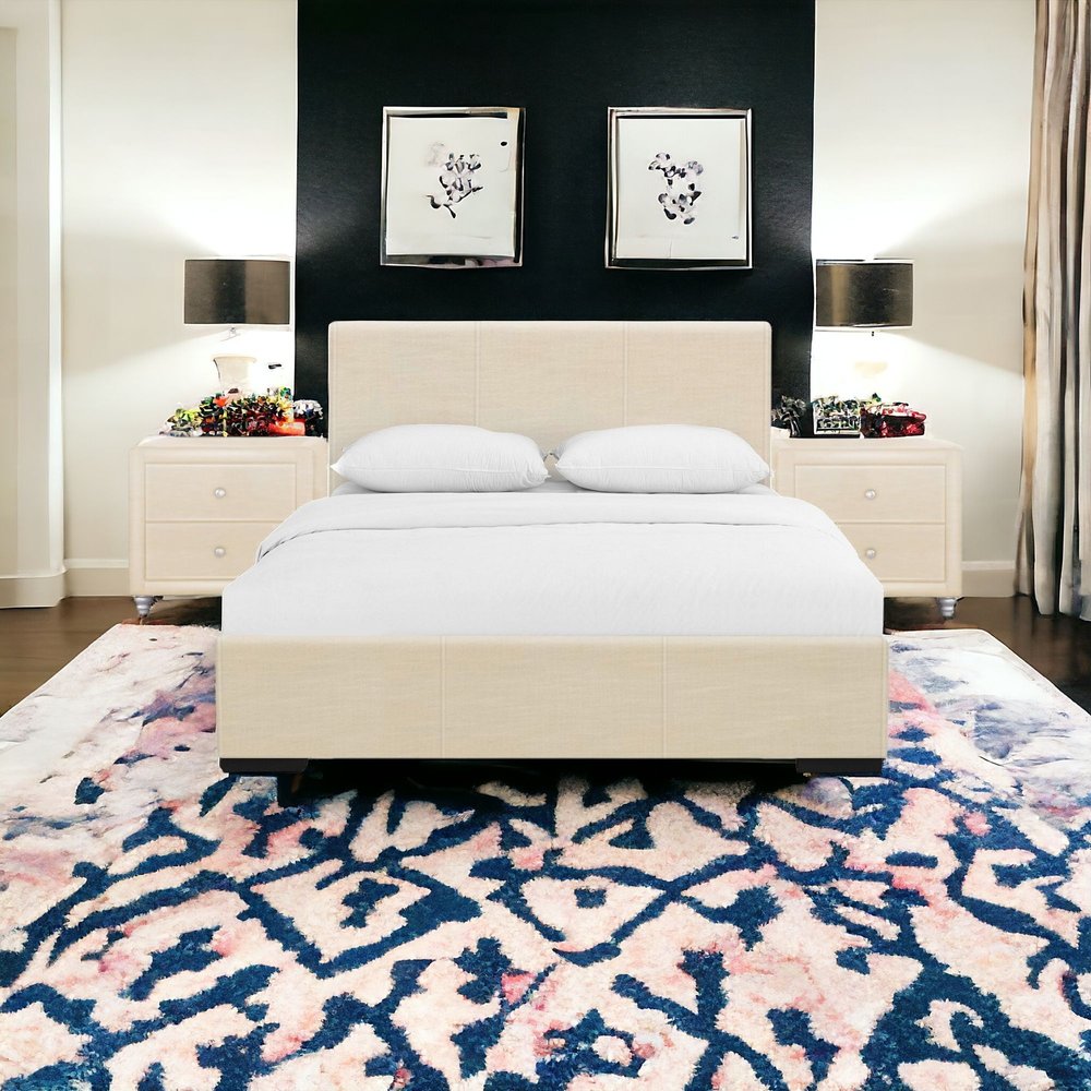 Create a haven for relaxation and sweet dreams with this fabulous beige wood and faux leather full bed frame. Fully upholstered in a beige rugged faux leather, this bed brings a unique and designer perspective to your space. We spend so much time in our bedrooms, thus making quality craftsmanship and good looks vitally important. Built to last, this piece not only looks good but reflects premium workmanship from top to bottom. This bed will help to create a peaceful environment that will provide restful slumber for years to come. 34.8-inch h x 56.7-inch w x 80.5-inch d.