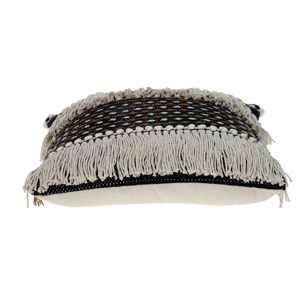 The 18-inch black and ivory striped cotton blend throw pillow with texture is the perfect decorative accessory for your home. This black and ivory colored decorative pillow is made from high grade cotton polyester blend that features lots of texture and tassels for a bohemian design sense. Super soft and built to hold its shape, this polyfill-filled pillow is a great option. A great decorative accessory to add color and dimension to your favorite chair, accent your sofa, or to use as part of your bed ensemble. 17.72-inch h x 17.72-inch w x 4-inch d