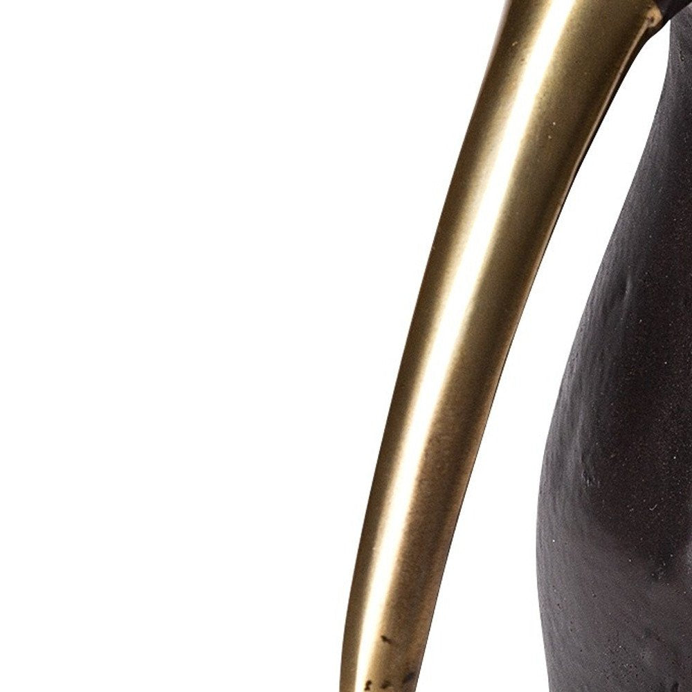 The whimsical yet unique nature of this Black Metal Tropical Bird Decor Piece is the perfect way to add some statement decor to your home. This bird piece is made from solid metal and has a very round shape with a sharp beak and webbed feet. The matte black color of the body combined with the golden color of the beak and feet adds a layer of depth to the whole look of this decor piece. Even though this decor piece leans more whimsical, the neutral colors make it suitable for formal decor as well. 7" H x 4" W x 7" D