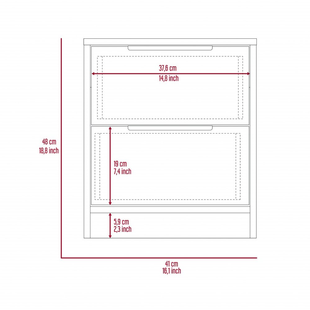 Good looking design and practical styling meet to form this 19-inch wood two drawer nightstand. Robust in design, the bed side table has been expertly crafted from manufactured wood. This piece has 2 drawers for your storage needs. The unsung hero of the bedroom, this nightstand is perfect for keeping a glass of water, lamp, alarm clock, jewelry, and more, close by and easily accessible. 18.9-inch h x 16.1-inch w x 14.3-inch d.
